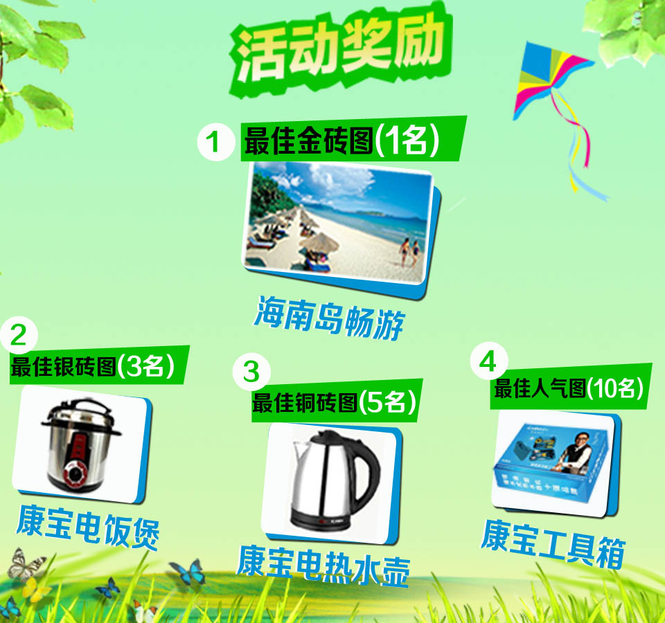 另外大众投票总票数前10名的选手(已获奖的选手不参与排名)均可获得康宝便捷工具箱一套。【惊喜不断】成功为心爱图片投票的用户,均可参与每天2次的刮刮乐有奖活动,奖品丰富,还等什么!快点到我的碗里来吧!