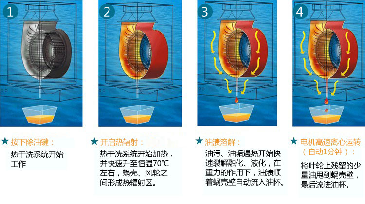 康宝作为消毒柜行业的领导者,在热辐射技术等方面有着多年的成功经验和十分突出的行业地位,康宝独创地把热辐射技术从消毒柜领域引入到烟机上,在烟机内部安装了一种先进的热干洗系统,只需轻按一下烟机的“除油键”,热干洗系统开始快速发热,并快速恒温升至70℃左右,从而在蜗壳、风轮之间形成一个均匀的热辐射区,而凝结的油污、油垢遇热开始快速裂解融化、液化,由于重力的作用,油粒、油渍等顺着蜗壳壁、风轮边缘滴落并自动流入接油盒内。这就做到了不用换一张油网、不拆一个螺钉、更不用一滴水,从而实现真正免拆洗,非常方便。