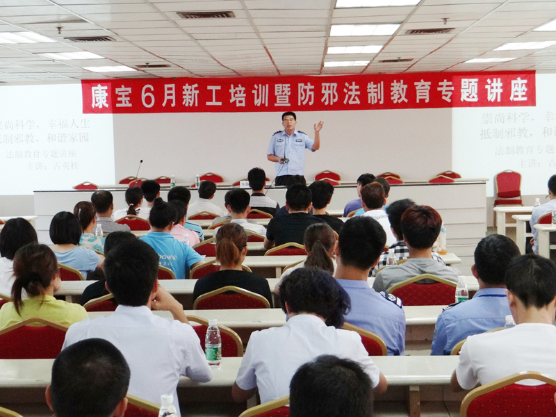 6月26日,广东省法制教育所副所长、《正能量顺口溜》作者古英桂老师来到康宝进行法制宣传讲座,古英桂讲座以“崇尚科学、幸福人生、抵制邪教、和谐家园”为主题,向我司员工宣讲了“什么是邪教”、“邪教的社会危害”、“邪教的特征”、“如何防范邪教”等知识,他结合典型案例生动地揭露邪教蛊惑人心,愚弄百姓,反党反社会的本质。古英桂老师充满激情的演讲感染了台下听讲的人,也深受大家的喜爱。