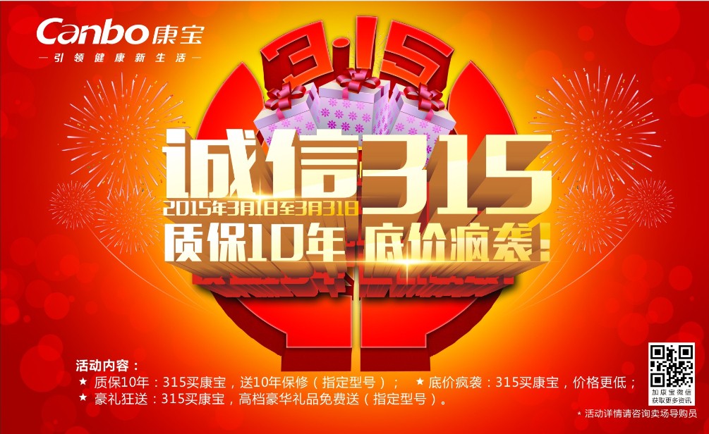 另外,315期间,康宝还推出了许可非常实惠的产品及套餐,并有丰厚的赠品,值得一提的是,本次活动,康宝油烟机、灶具、消毒柜、热水器等全面优惠大促销,真正让利于消费者。具体活动详情详见当地苏宁、国美电器康宝专柜及康宝各地专卖店。