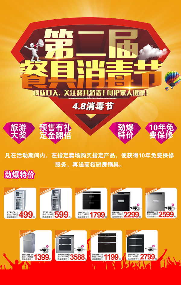 据了解,康宝发起的第二届餐具消毒节将从4月1日持续至4月19日,消毒节期间,康宝将推出多项优惠促销活动。消费者购买任何一款康宝消毒柜,扫康宝官方微信二维码都可以参与幸运抽奖活动,获奖者可享受超值豪华游,一等奖为台湾1周游、二等奖为云南1周游、三等奖为海南3日游。买指定型号的消毒柜,可享受10年免费保修政策;预售有礼,定金翻倍,此外,康宝还开展了厨电“以旧换新”活动,活动详情详见全国苏宁、国美电器康宝专柜或康宝专卖店。在线购买请关注康宝官方授权旗舰店。