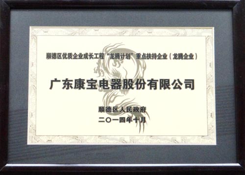 根据淘汰一批,新评定一批的原则,2014年顺德启动了龙腾星光企业的复评和申报工作,经过企业的申报和镇街的初审,部门的审核,专家的初评和复审,政府的公示等多个环节,区政府重新公布了新一批“龙腾企业”和 “星光企业”榜单,广东康宝电器股份有限公司再度获评为“顺德龙腾企业”。这是康宝股份第三次获次殊荣。
