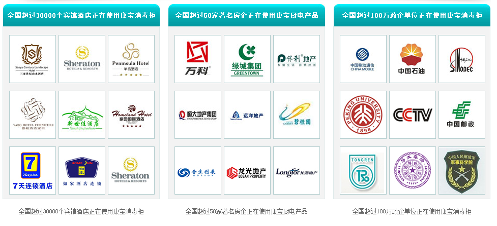 康宝是消毒碗柜行业的知名品牌,连续27年保持了行业销售前列的地位。康宝研发出包括立柜、卧柜、毛巾柜、嵌入式柜、壁挂式消毒柜、商用大碗柜、医疗器械柜、衣物消毒柜、内衣消毒柜、奶瓶消毒柜、桌面消毒柜、3D眼镜消毒柜、红酒杯消毒柜、拉篮消毒柜等数十大系列:研发出高温、臭氧、紫外线、喷淋、高温蒸汽等消毒方式:产品容积从15升到1800升不等;产品种类超400多个。康宝消毒碗柜被保利宾馆、喜来登酒店、7天酒店、如家酒店等宾馆/酒店广泛采购。全国有超过3万个宾馆/酒店在使用康宝的消毒碗柜。