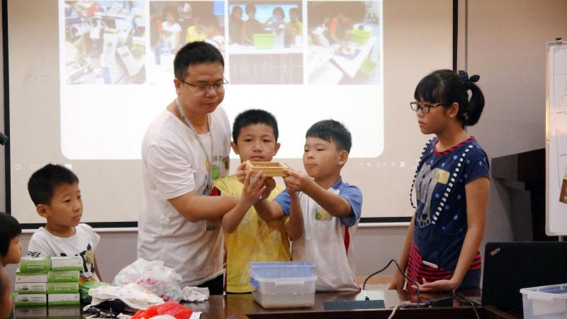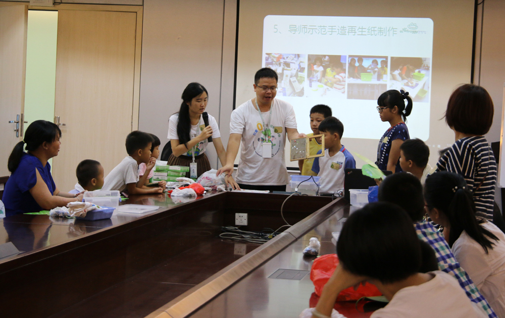 顺德区环宝蛙青少年环境体验中心彭方明老师向大家演示如何用牛奶盒巧制再生纸